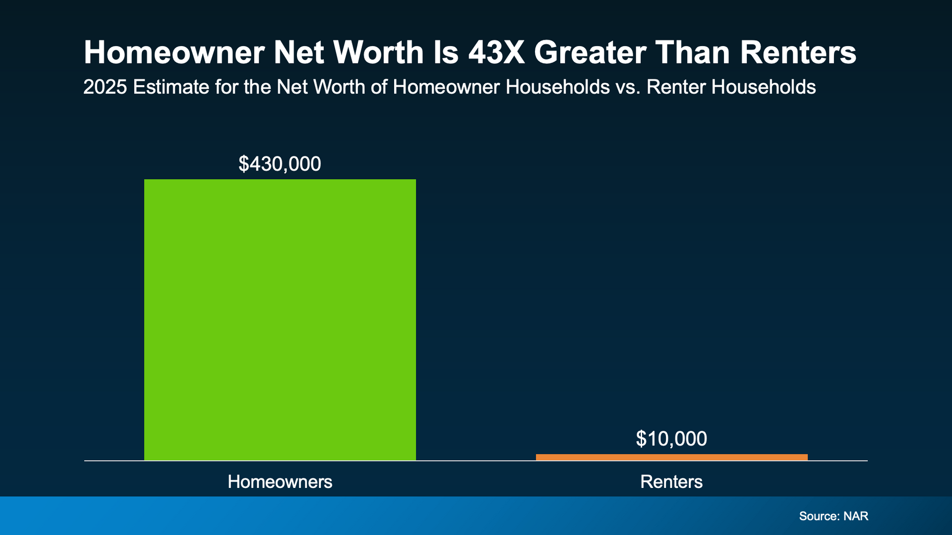 The chart above shows the gap clearly. Homeowners have a much higher median net worth than renters, and that difference has grown over time. In the 2025 estimate shown in the visual, homeowners reached about $430,000 in median net worth, while renters were at about $10,000.